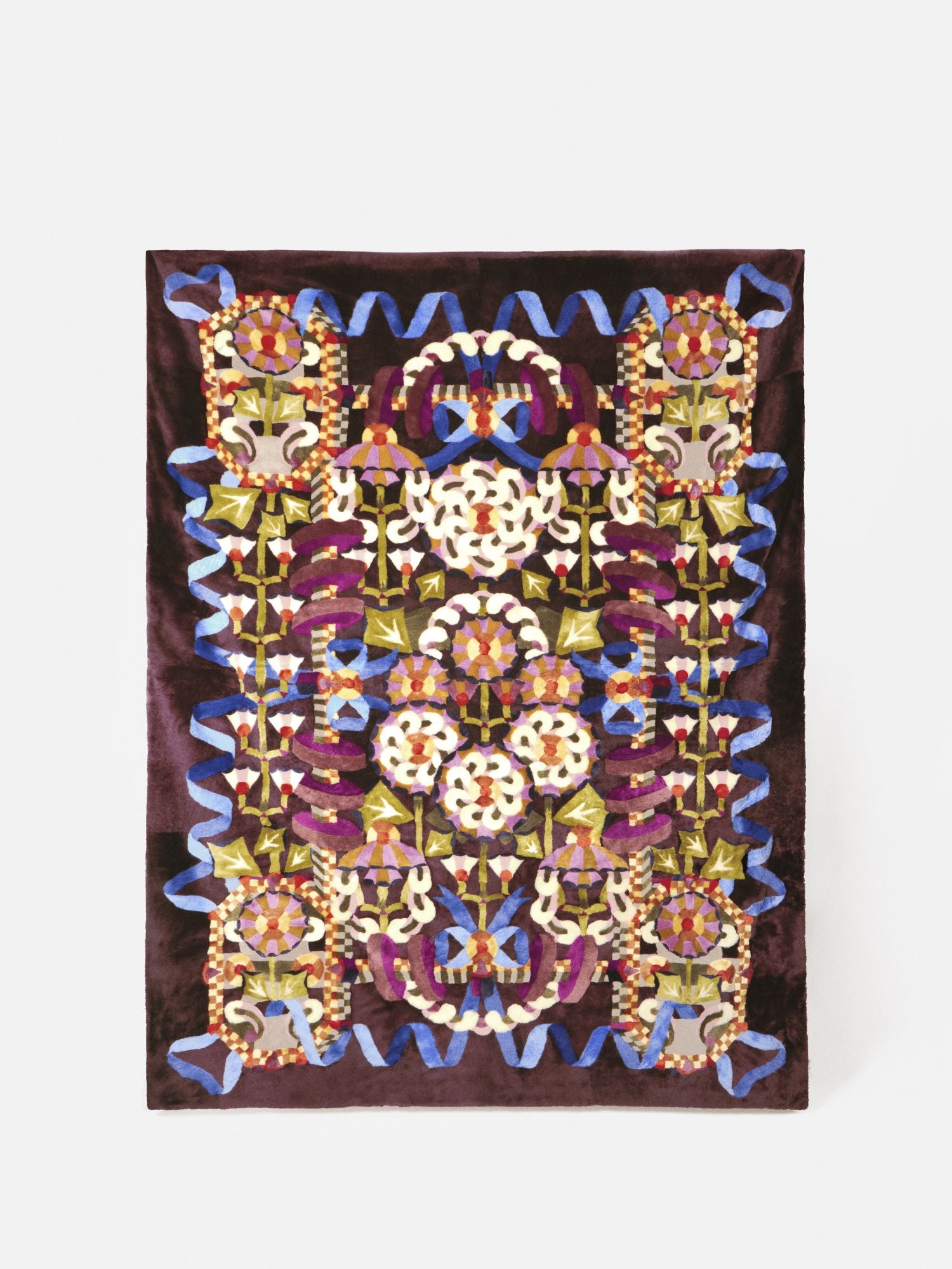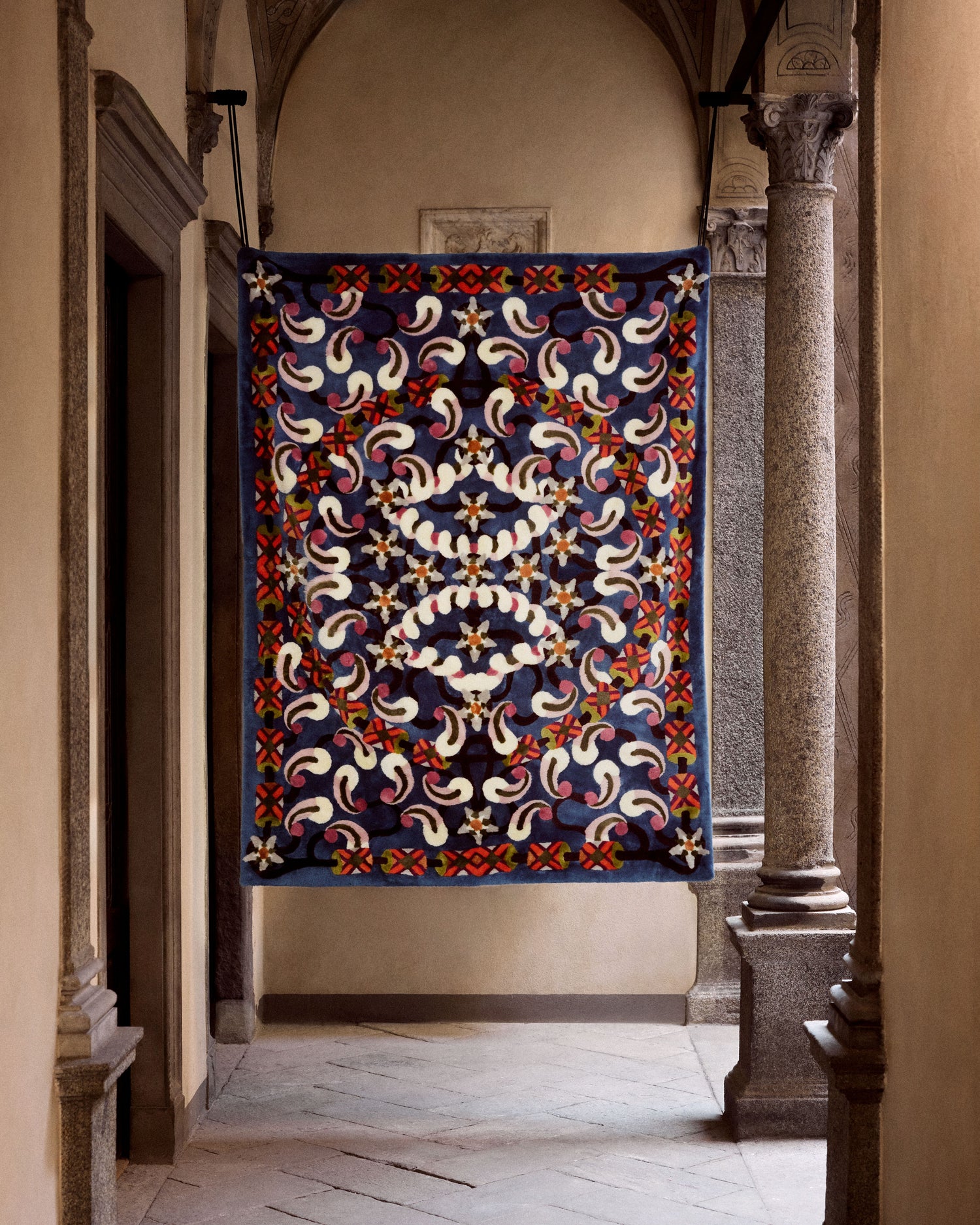 Presented in the medieval courtyard at 7 via Santo Spirito, this dreamlike collection includes seating, poufs, cushions, throws, and lighting, in which Pierre Marie's singular ornamentation is expressed with silversmith-like meticulousness. The artist unfolds a bucolic fresco where sky and earth meet through two themes: "The Meadow" and "The Firmament." The Meadow evokes an enchanted nature, woven with looped ribbons, geometric foliage, and floral corollas, while The Firmament lifts the gaze to the heavens, where a ballet of Western stars, striped pearls, and cashmere arabesques composes a textile cosmogony.
