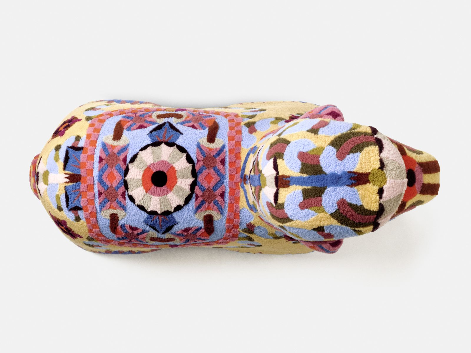 Following the pastoral pictorial tradition of the 19th century, Pierre Marie revisits classic motifs: shepherds, sheep, and the pastel ribbons of Italian Easter pastries. Each piece is designed as a textile landscape meticulously drawn and hand-cut. This graphic vocabulary is expressed through cushions, cylindrical poufs, and monumental throws. The most imposing, a 260 × 200 cm model lined with cashmere, made of over 5,000 different shearling pieces, serves as a matrix for the entire collection. "Everything started from the design of this throw. All the graphic elements are present there. I then extracted these elements to compose each piece, down to the sheep's eye and the details of its face." — Pierre Marie A lantern-shaped suspension lamp, clad in shearling, is also featured, as well as a pair of cylindrical poufs on which the "La Prairie" motifs unfold in a heraldic interplay dominated by a central medallion. This collection offers a poetic and playful vision, merging Pierre Marie's poetic approach and the expertise of the Yves Salomon ateliers.
