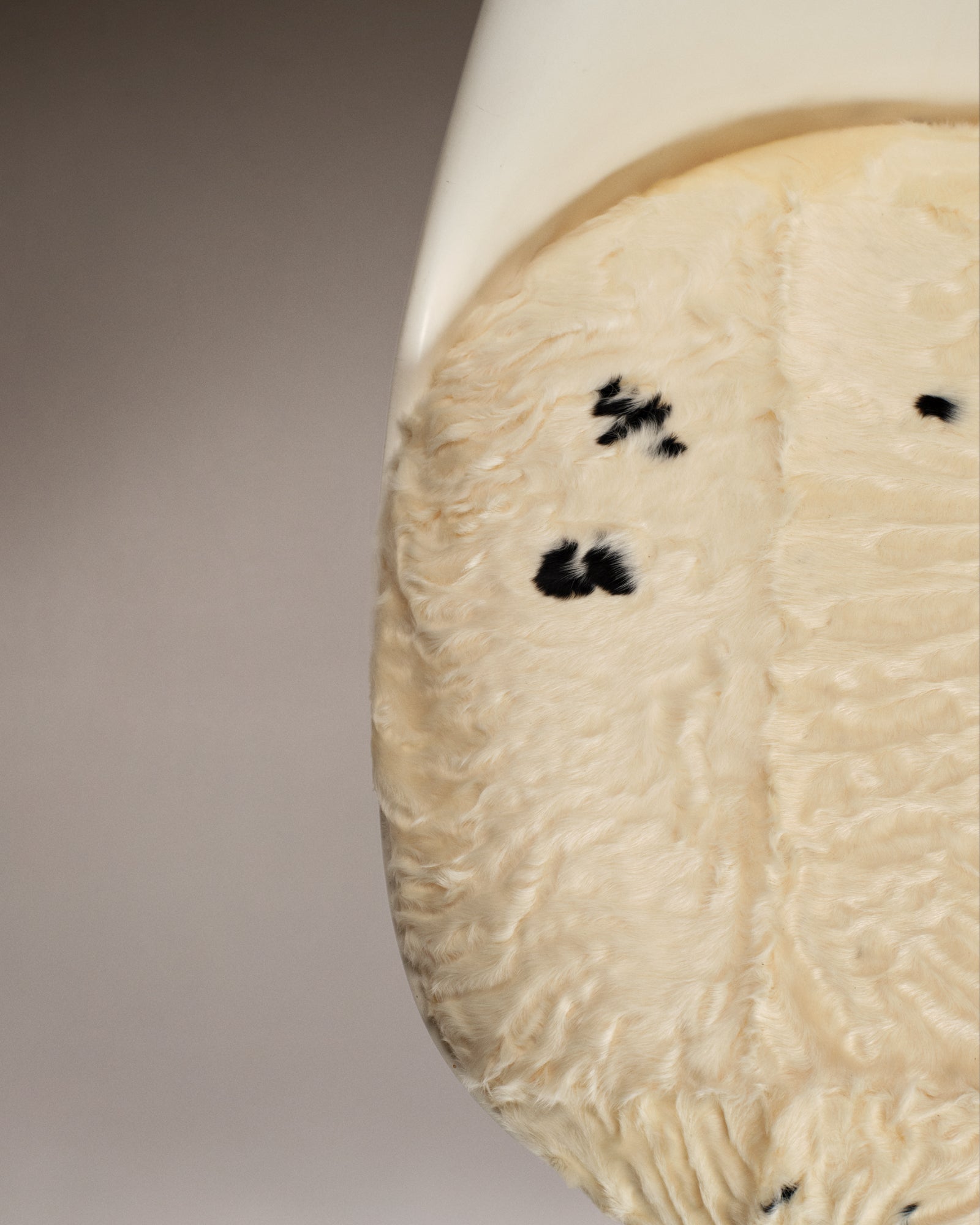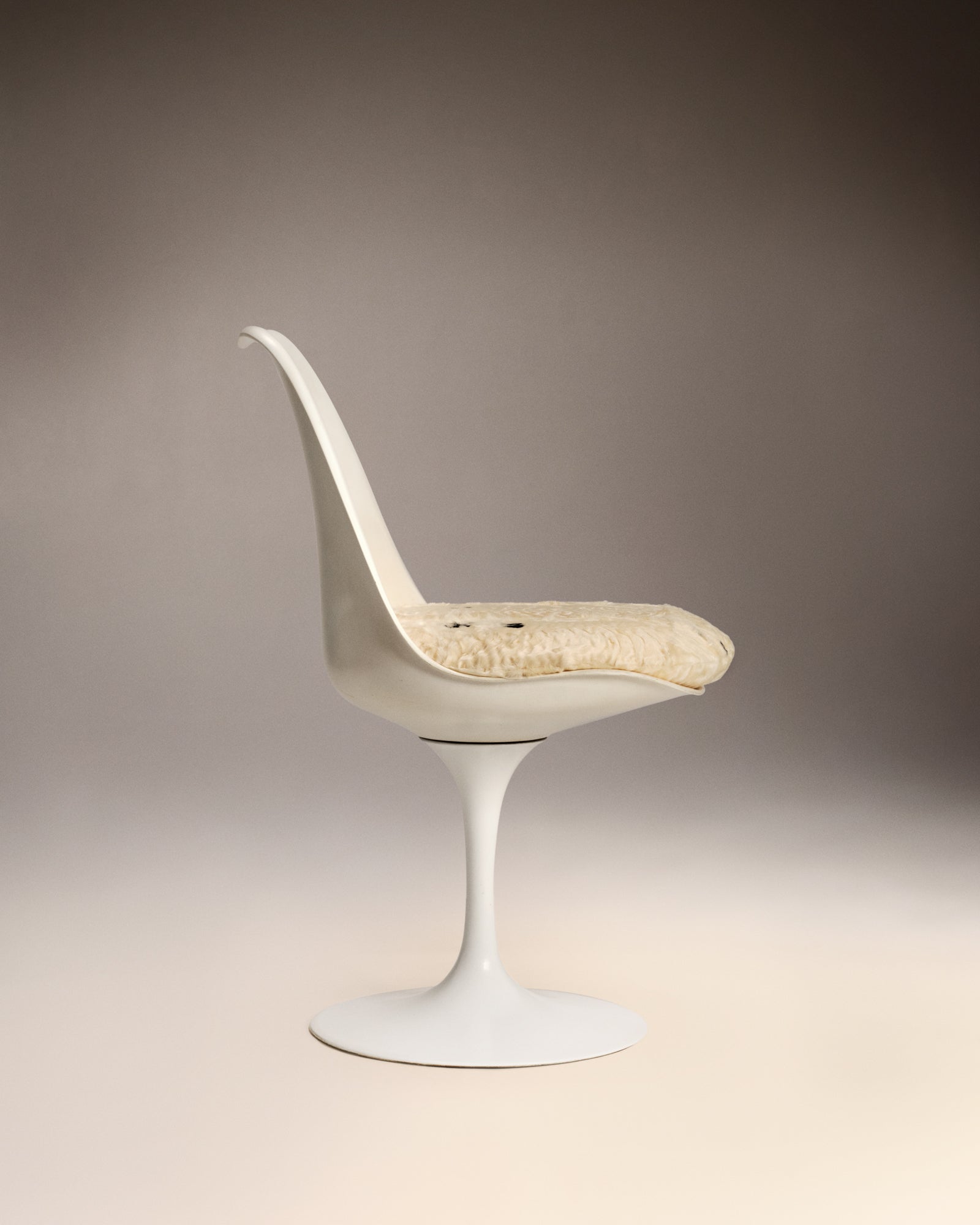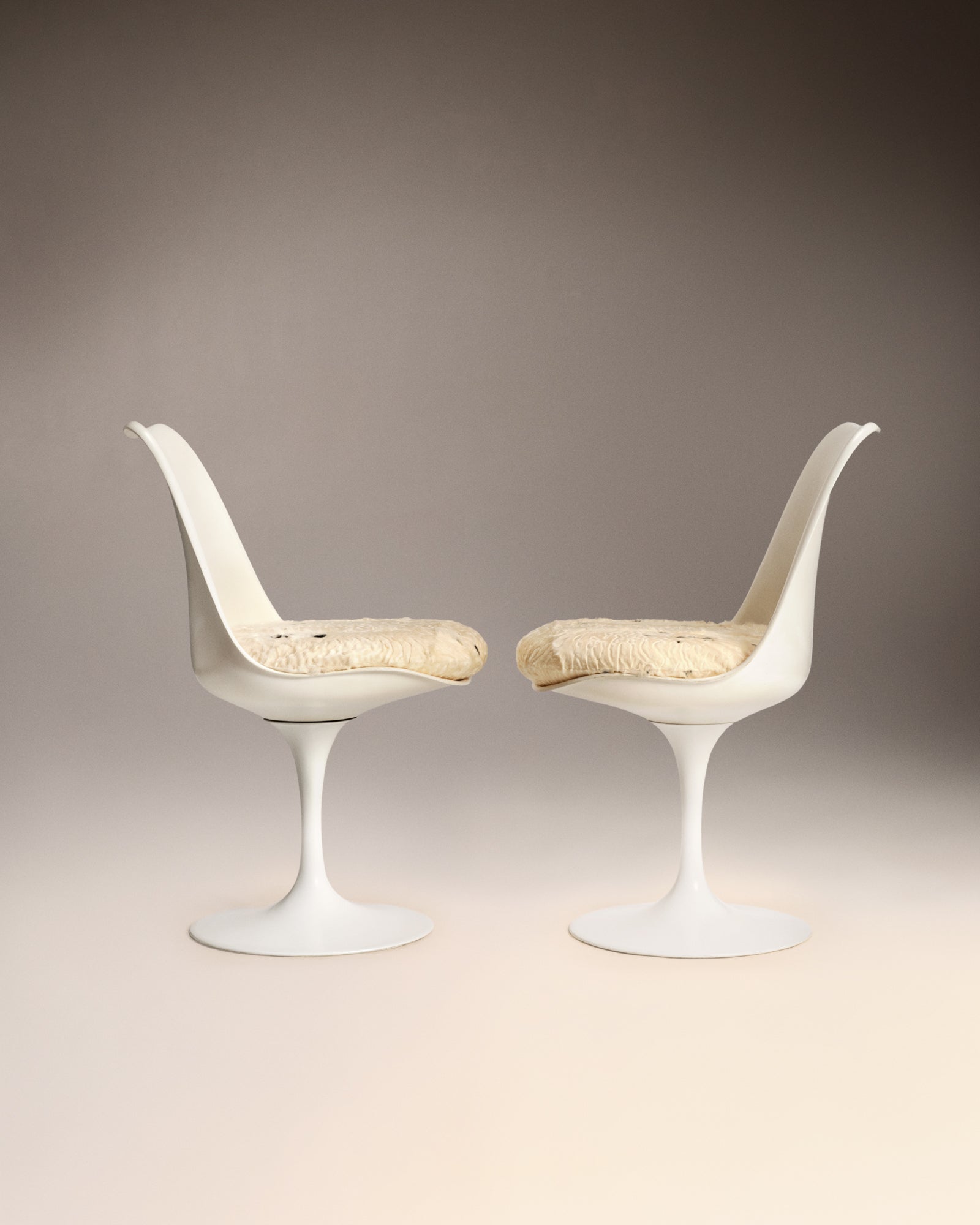 Eero Saarinen (1910–1961) Set of 4 Tulip swivel chairs, model created in 1956.White Rilsan-lacquered cast aluminium base, thermoformed fibreglass shell in white lacquer. Seat cushions upholstered in astrakhan by our workshops.