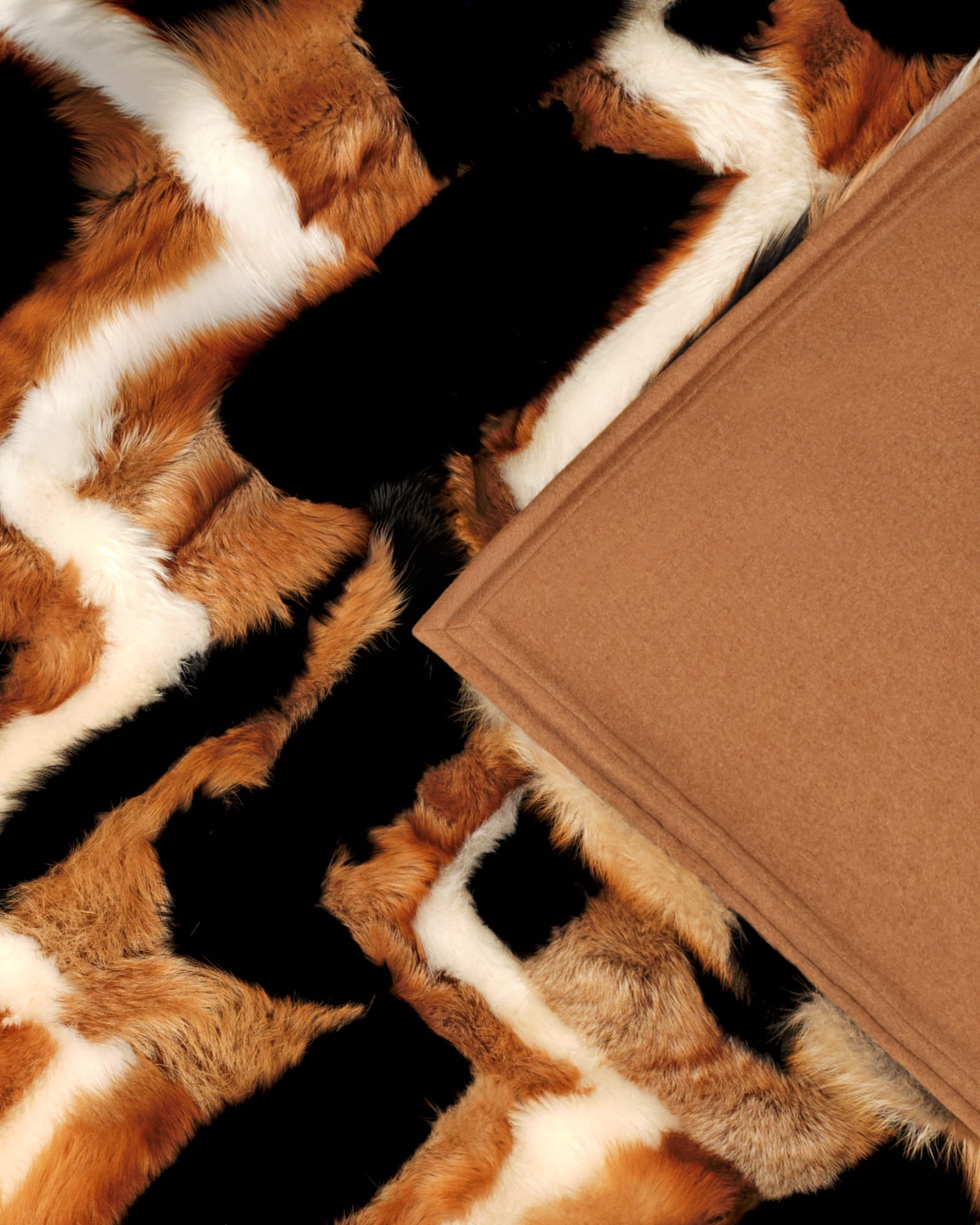 Marmot and fox throw, 229 × 229 cm. Backed with camel cashmere.