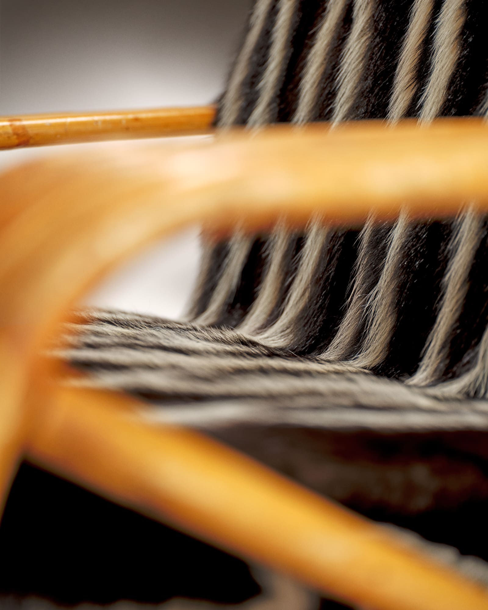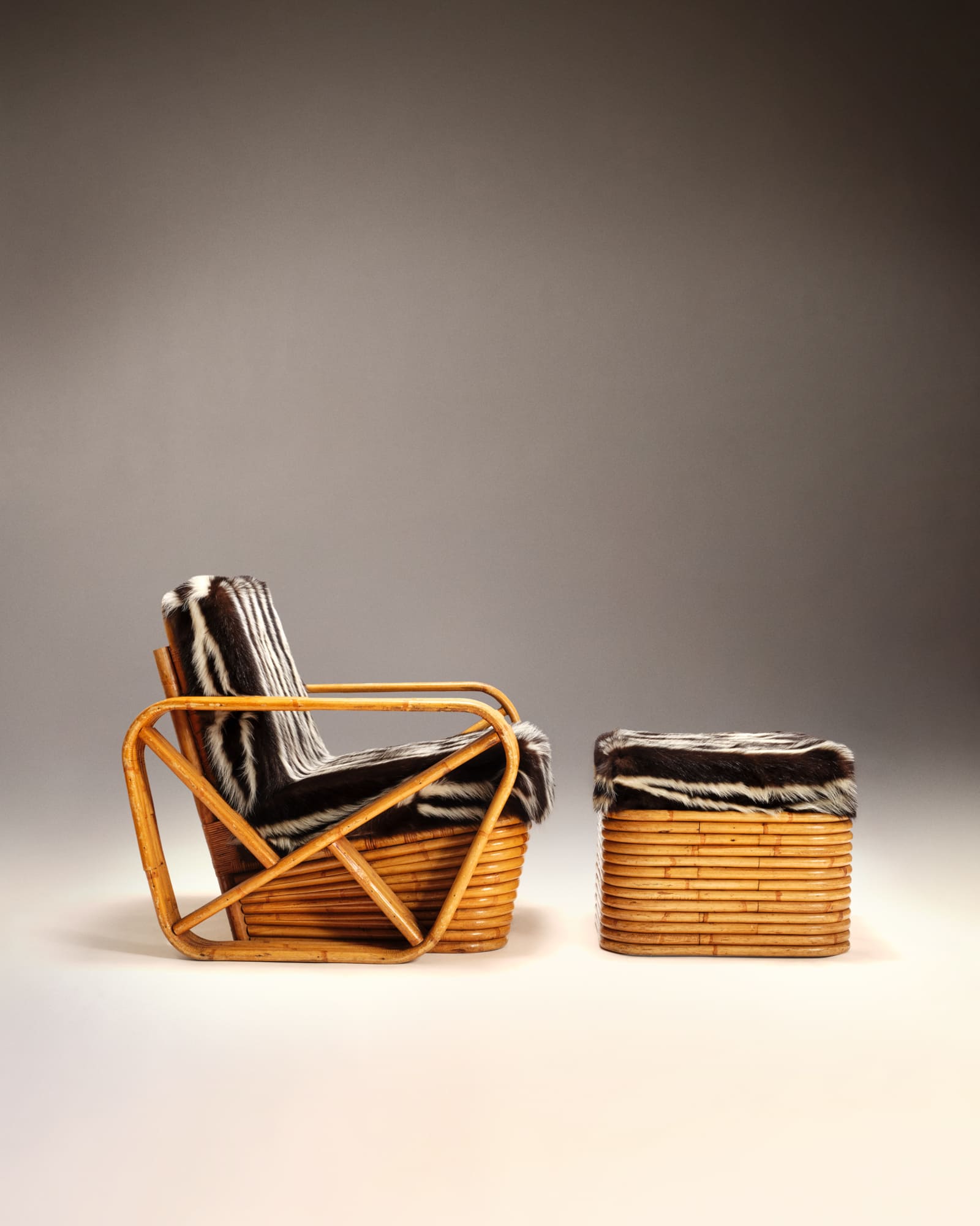 Rattan structure, back cushion, seat and ottoman upholstered in skunk by our workshops.
